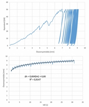 A vizsgálatokat vastag falú acélmozsárban (d = 170 mm, A = 226,87 cm2), INSTRON univerzális nyomógéppel (Típ.: 5989 L 1217) végeztük max. 50 kN és min. 3 kN közötti lüktető terheléssel. A vizsgálatoknál N = 10, 20 és 30 ismétlési számot alkalmaztunk.