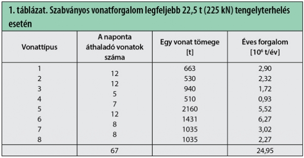 A 225 kN tengelyterhelés figyelembevételével végzett fáradásvizsgálathoz a 100 éves tervezett élettartam alatt a szabványos tehermodellek figyelembevételével közel 2,5 millió vonatáthaladás adódik (1. táblázat).